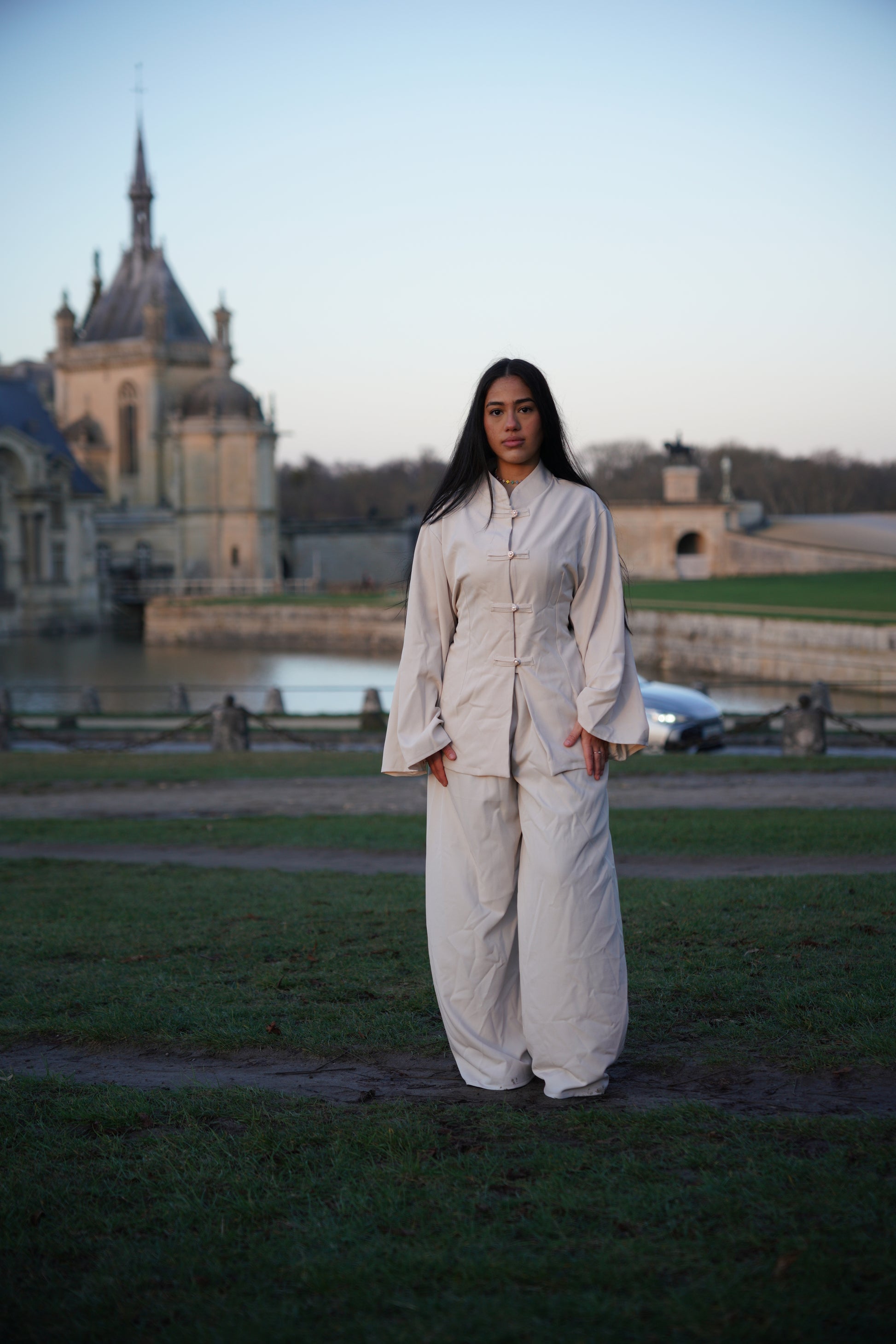 Composé d'un haut fluide à manches larges et d'un pantalon fluide, il offre une allure élégante et affirmée et naturellement raffinée.