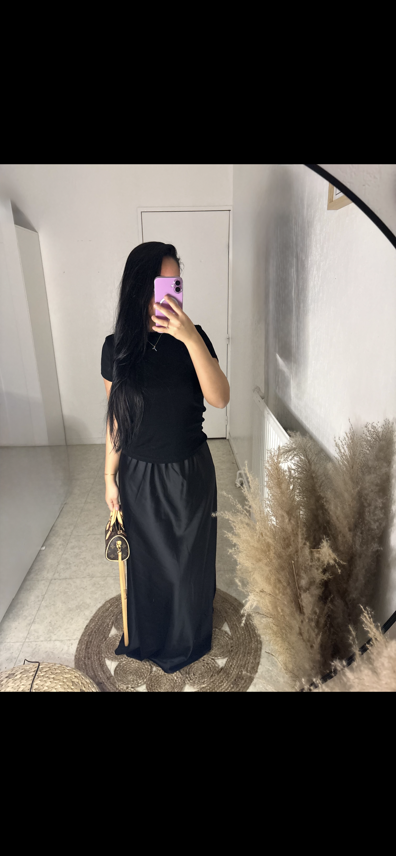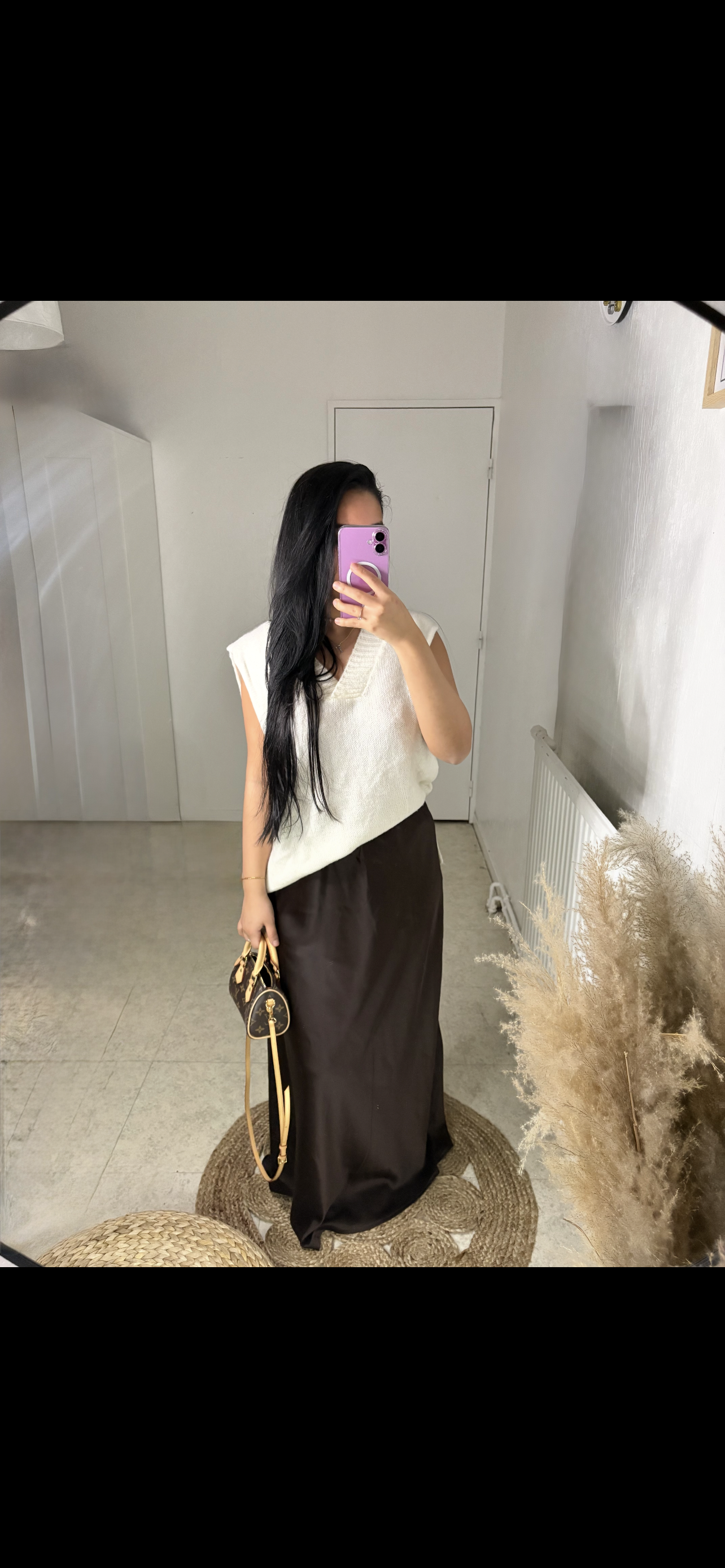 Sa matière satinée douce et légérement brillante apporte une touche chic sans en faire trop.Elle se porte aussi bien avec un pull oversize qu'avec un haut structuré pour un look plus habillé.