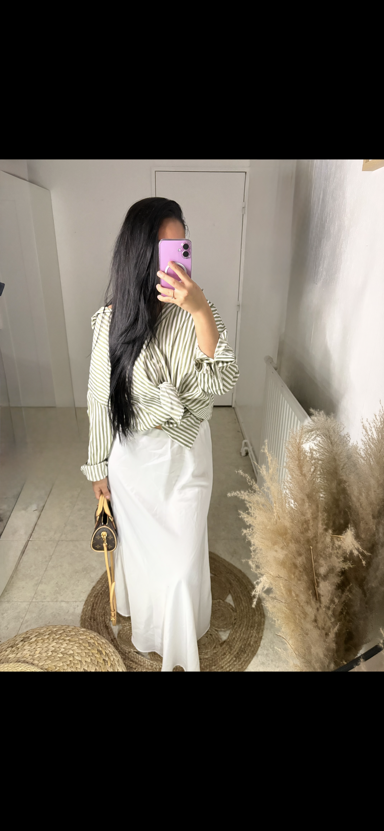 Notre jupe satinée sublime la silhouette avec sa coupe fluide et son tombé élégant.